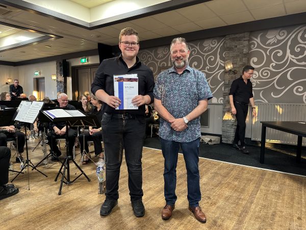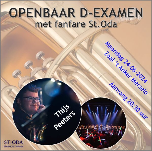 Op maandagavond 24 juni heeft Thijs zijn openbaar D-examen met de fanfare van St.Oda geweldig volbracht. Hij speelde het prachtige stuk Capriccio van Bart Deckers. Afgelopen donderdag haalde hij al zijn gesloten D-examen. Maandag deed hij het tijdens zijn openbare deel ook weer fantastisch, met als resultaat: zijn welverdiende D-diploma! Wij zijn als vereniging ontzettend trots op Thijs! Super knap gedaan, gefeliciteerd Thijs!
