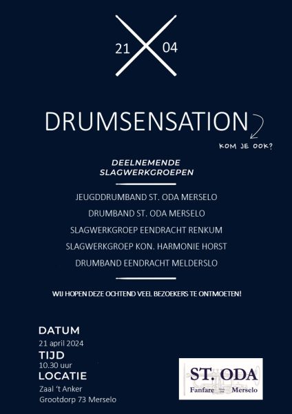 In Zaal ‘t Anker in Merselo vond vandaag Drumsensation plaats. De drumband en jeugddrumband van Fanfare St.Oda Merselo organiseerde dit concert gezamenlijk met de slagwerkgroepen van Muziekvereniging Eendracht Melderslo, Slagwerkgroep Koninklijke Harmonie van Horst en Renkumse Muziekvereniging Eendracht.