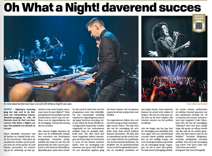 Op zondag 8 oktober vond het jubilarissenconcert van de fanfare en drumband van Fanfare St.Oda Merselo plaats. Op deze avond werd aan de jubilarissen een concert aangeboden. Hierbij kon iedereen alvast genieten van een voorproefje op ons eindejaarsconcert ” Oh What a Night! ” wat op zaterdag 9 december in Schouwburg Venray plaatsvindt.